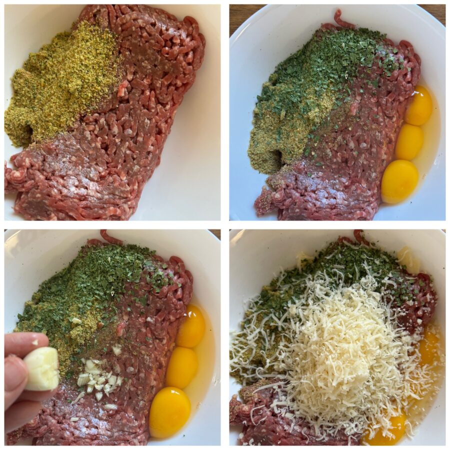 Raccogliete nella ciotola la carne macinata, il pangrattato, il prezzemolo tritato e un pizzico di aglio tritato anch’esso. Aggiungete le uova 3 o 4 al bisogno, il formaggio grattugiato (pecorino per un gusto più inteso, grana per un sapore meno forte),