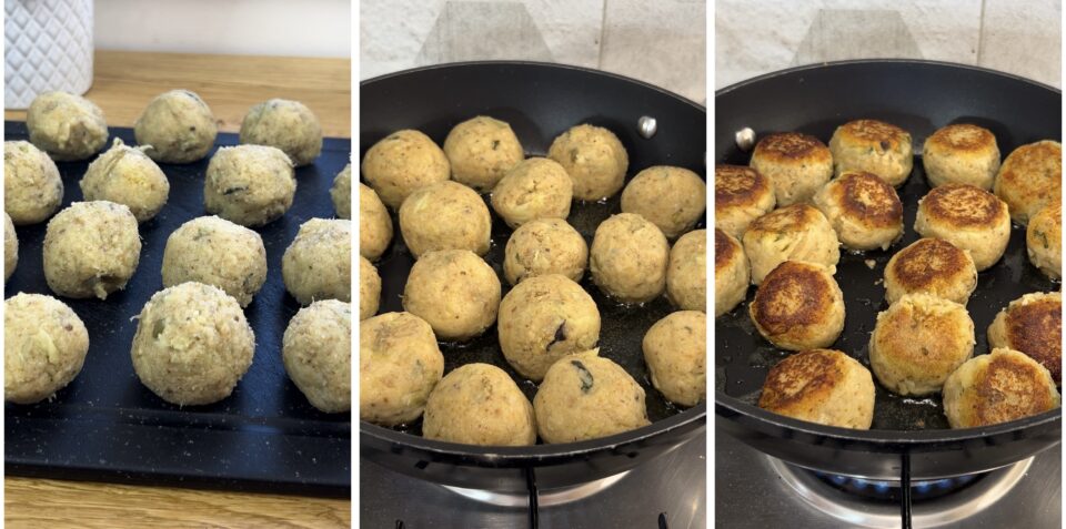 quindi assemblate le polpette, che dovranno essere poco più grandi di una noce. Scaldate un buon giro d’olio in una padella capiente, adagiate le polpette e lasciatele dorare da una parte e dall’altra, quindi spostatele dalla pentola e mettetele da parte.