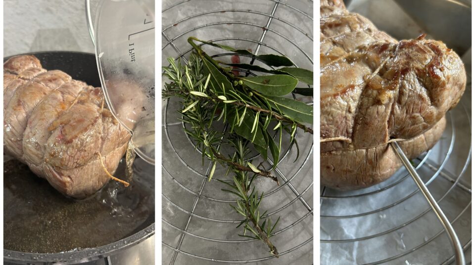 Adagiate il rosmarino, la salvia e e l’alloro su una gratella, e spostate la gratella su una teglia o una leccarda ricoperta di carta forno (in questo modo i succhi di cottura della carne non bruceranno o se bruceranno non sporcheranno troppo la teglia), spostatevi sopra il pezzo di carne, infilzatelo con una sonda a filo (sono le sonde con un filo lungo, che permettono di monitorare la cottura senza aprire di continuo il forno e vi consentono di non infilzare la carne di continuo, perché il pezzo per la lettura della temperatura sta fuori dal forno) e cuocete in forno caldo, a 220° nel ripiano centrale per 15 minuti.
