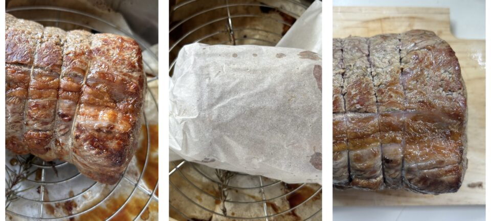 Se non avete un termometro da cucina (ma vi consiglio di acquistarlo per non sbagliare la cottura), si può valutare la cottura dell’arrosto con un ago molto lungo. Infilandolo nella carne avendo cura di arrivare al centro, una volta estratti va appoggiato sotto il labbro inferiore e dovrà risultare più caldo rispetto alla nostra temperatura ma non tanto caldo da scottarsi. Mi raccomando: evitate di bucherellare la carne più volte!