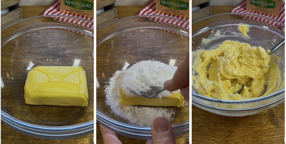 Preparate la frolla: il procedimento è un po’ diverso dal solito, ma vi permetterà di avere a disposizione una pasta frolla che non si rompe, elastica alla lavorazione e friabile dopo cotta. Raccogliete il burro morbido a temperatura ambiente in una ciotola, unite lo zucchero a velo e amalgamate con la forchetta fino ad ottenere una crema omogenea.