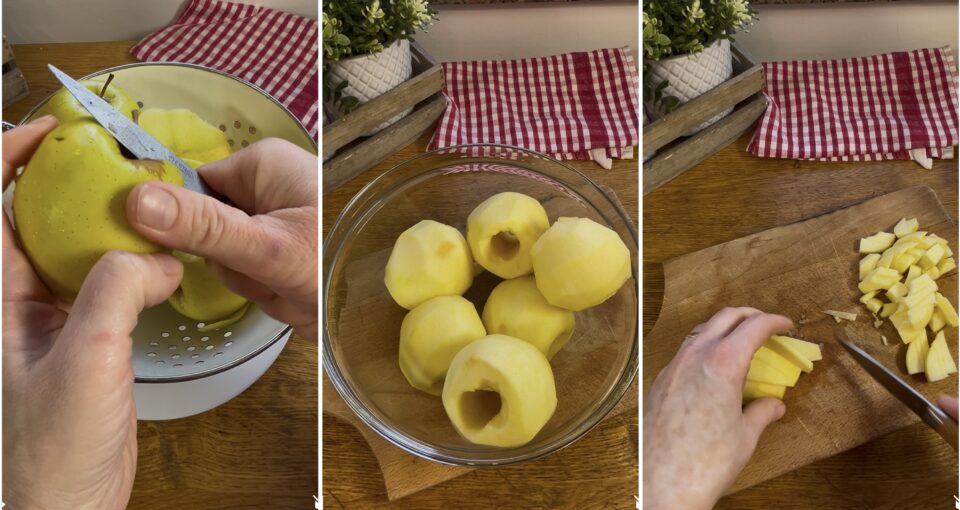 Per fare questa deliziosa crostata alle mele, iniziate dal ripieno: sciacquate le mele, pelatele, privatele del torsolo e tagliatele a tocchetti molto piccoli. (E ponete il burro per la frolla fuori dal frigo)