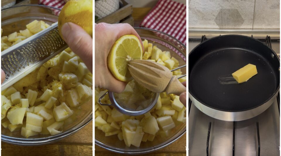 Raccoglietele in una ciotola, aggiungete il succo di mezzo limone e tutta la scorza grattugiata, mescolate. Sciogliete delicatamente il burro in padella,