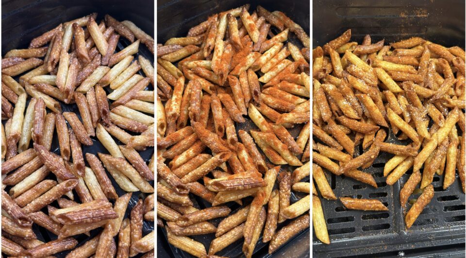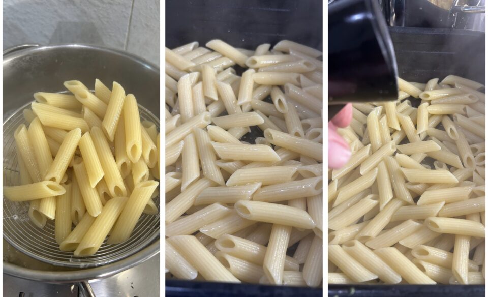 Cuocete la pasta nel mondo classico, lessandola in acqua leggermente salata fino a che non risulterà un po’ scotta. Quindi scolatela per bene e raccoglietela nel cestello della friggitrice ad aria. Conditela con qualche spruzzo d’olio e se vorrete una manciata di formaggio grattugiato (io non l’ho usato) e cuocete