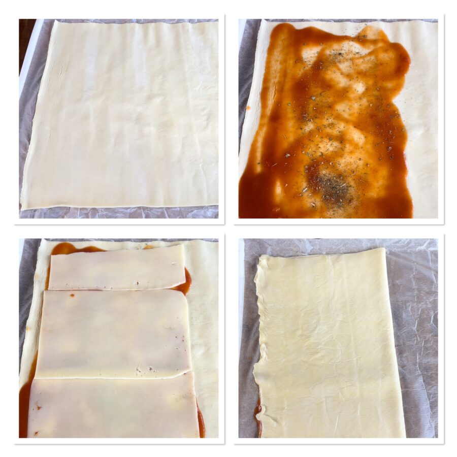 Srotolate la pasta sfoglia e su metà di essa e sul lato corto, distribuite un velo di salsa di pomodoro, origano e uno strato di formaggio a fette (io ho utilizzato del gouda che compro già a fette, molto comodo). Ripiegate a libro, sigillate i bordo e con la stessa carta forno spostate su una teglia.