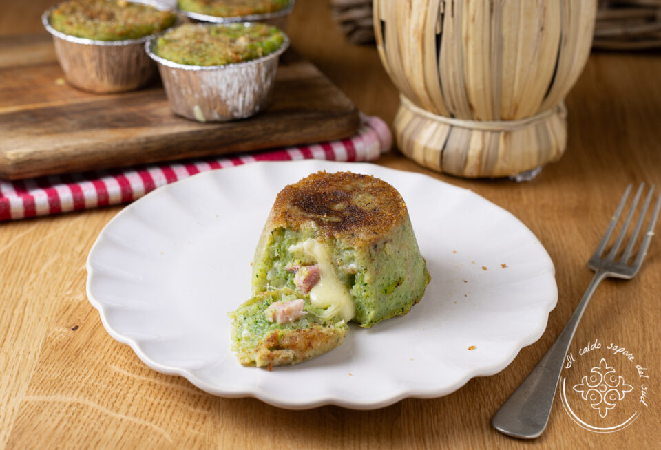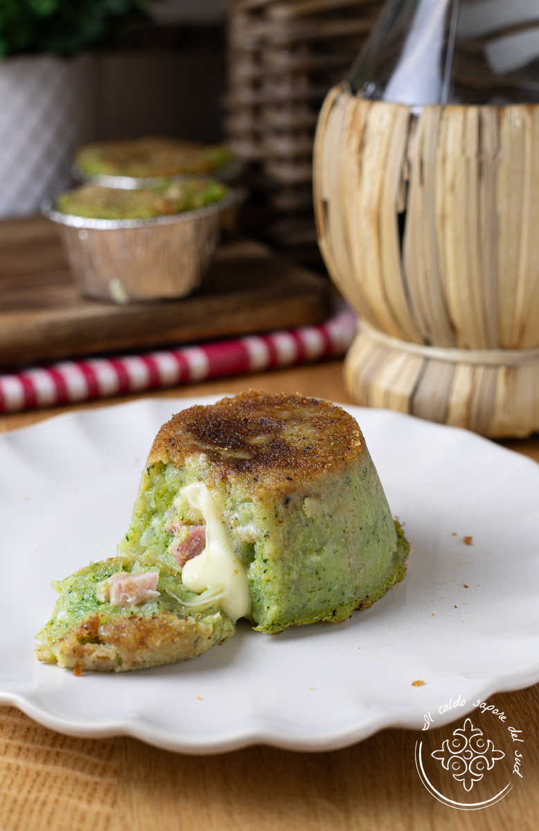 Piccoli sformatini di patate e broccoli mono porzione, con un cuore filante di formaggio e pancetta , o se volete un nome più chic, flan di broccoli e patate. Una ricetta con le patate saporita e originale e allo stesso tempo una ricetta sfiziosa con i broccoli, adatta anche ai più piccoli.
