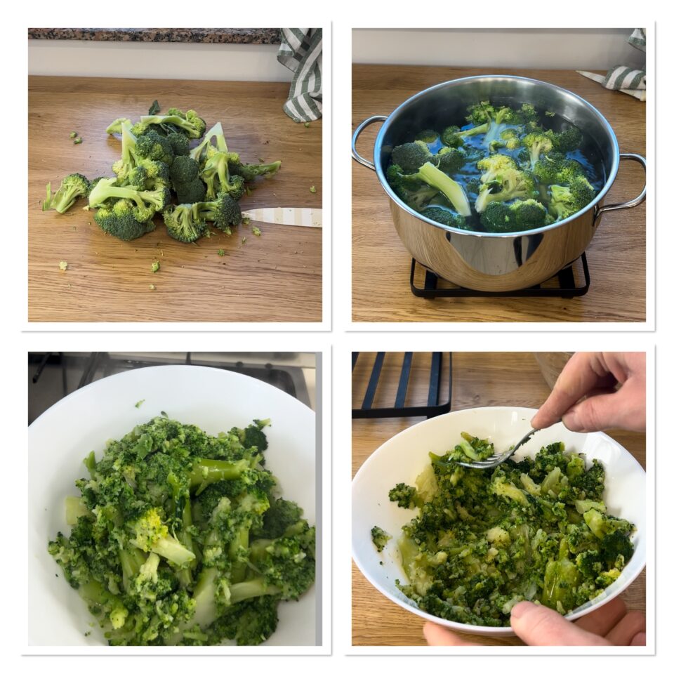 Separate le cimette dei broccoli le une dalle altre, eliminate la parte più dura del gambo tirandola via con un coltello, sciacquatele e tuffateli nell’acqua salta bollente. Cuoceteli fino a che non risulteranno morbidissimi, quindi scolateli molto bene, raccoglietele in una ciotola, lasciateli intiepidire e schiacciateli molto bene con una forchetta.