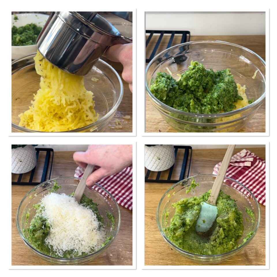 Mischiate i broccoli alle patate schiacciate, amalgamate e aggiungete sale, pepe, olio e formaggio grattugiato. Mescolate fino ad ottenere un composto omogeneo e lavorabile, se troppo morbido aggiungete un cucchiaio d pangrattato, ma non dovrebbe essere necessario.