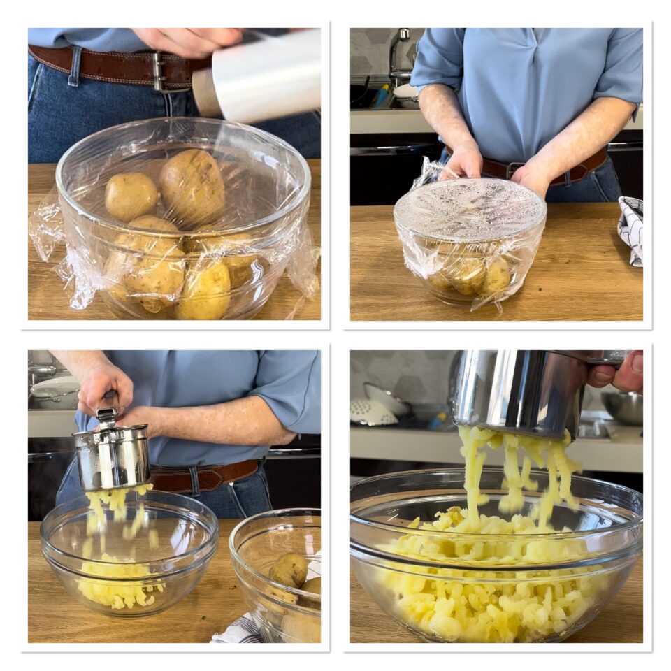 Raccogliete le patate in una pentola, coprite d’acqua, aggiungete il sale e cuocete per 35-40 minuti dal bollore o fino a che infilzandole con uno stecchino non risulteranno morbide, non lasciate che scuociano, piuttosto lasciatele un po’ indietro, continueranno a cuocere per inerzia. Scolatele e lasciatele raffreddare delicatamente a temperatura ambiente. Non passatele sotto l’acqua fredda perché si romperebbero. Oppure fate come me, raccoglietele in una ciotola dopo averle lavate, versate mezzo bicchiere d’acqua e coprite con pellicola in modo ermetico. Cuocete al microonde a 750w per 17 minuti, quindi sfornate e lasciate intiepidire qualche minuto prima di schiacciarle con uno schiacciapatate.