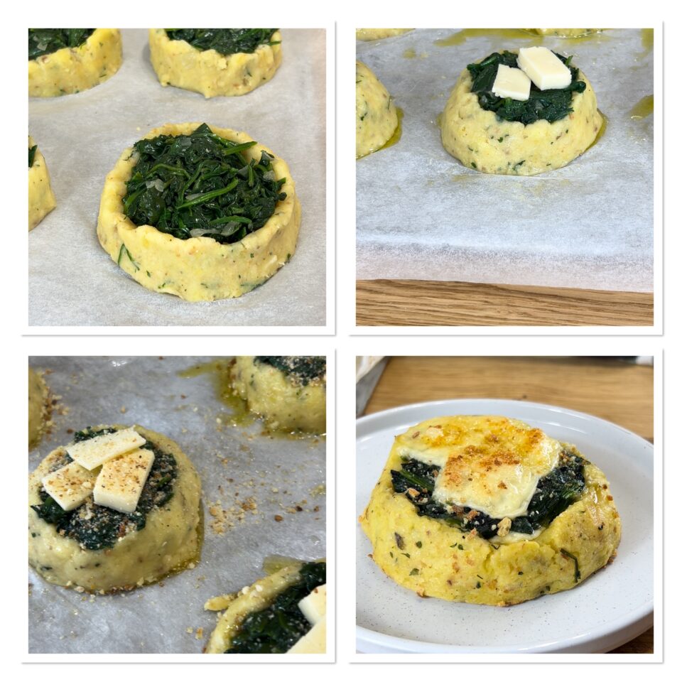 Modellate le palline , formando un incavo che possa contenere il ripieno e farcitele con un po’ di formaggio, gli spinaci e ancora un po’ di formaggio (vi consiglio di tagliuzzare un po’ gli spianci prima di distribuirli sui tortini, sarà più comodo mangiarli).