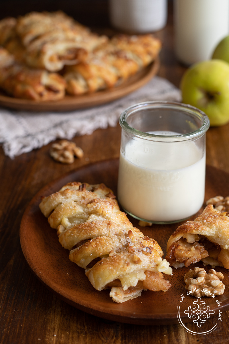 Treccine di sfoglia con mele e noci come quelle del bar, la ricetta di pasta sfoglia e mele più buona che c’è! Quando vado a far colazione al bar con mio marito, l’unica cosa che amo davvero tra tutta la viennoiserie disponibile è rappresentata dalla treccina con mele e noci. Mele, noci e pasta sfoglia sono infatti per me l’unione perfetta che da vita ad un dolce eccezionale! Fare la sfoglia con mele e noci non è difficile, anzi è facilissimo e possiamo farla davvero tutti. Per realizzare questo piccolo fagotto di profumo e gusto, infatti servono solo delle piccole accortezze e il risultato è talmente sfizioso, che lo ripreparerete altre mille volte! Ma come si fanno le treccine del bar con mele e noci? Andiamo in cucina a prepararle insieme, io vi assicuro che è davvero un gioco da ragazzi e che con un po’ di pasta sfoglia, delle mele e delle noci, preparerete un dolce per la colazione veloce, goloso e super chic!