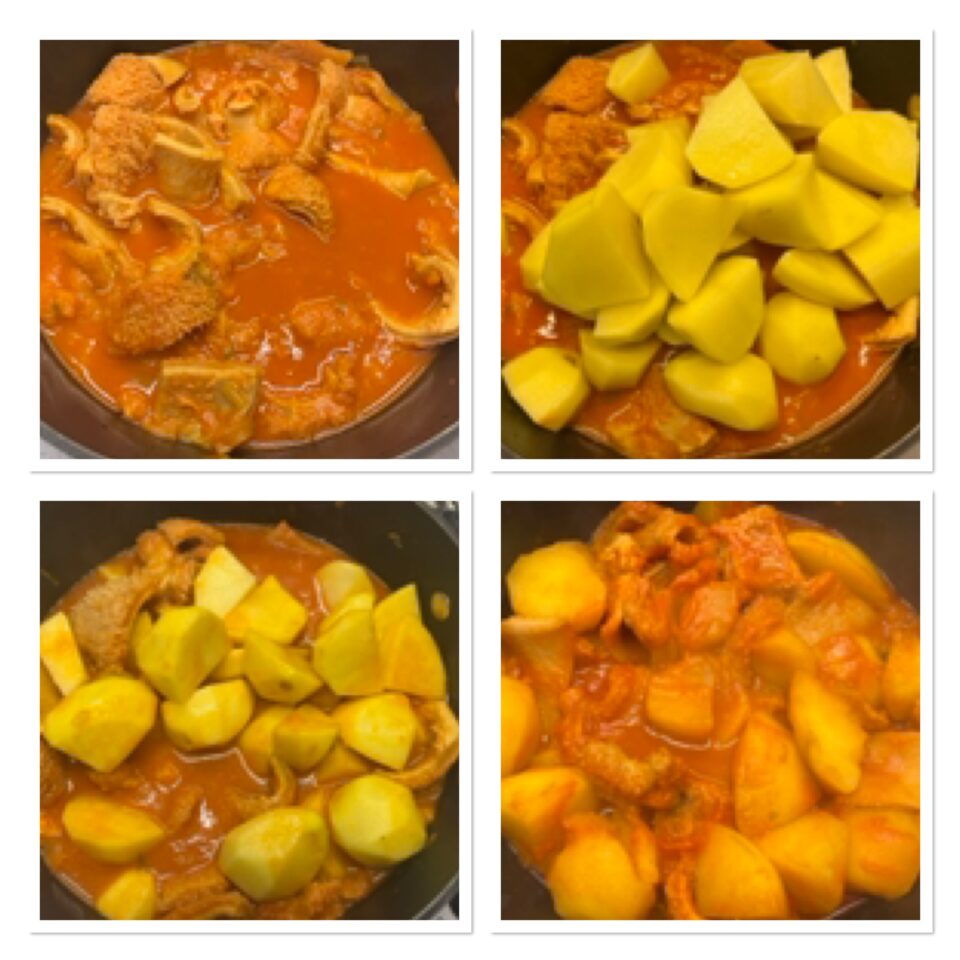 Trascorso il tempo, quando la trippa risulterà morbida, unite le patate sciacquate, pelate e tagliate in pezzi grandi.