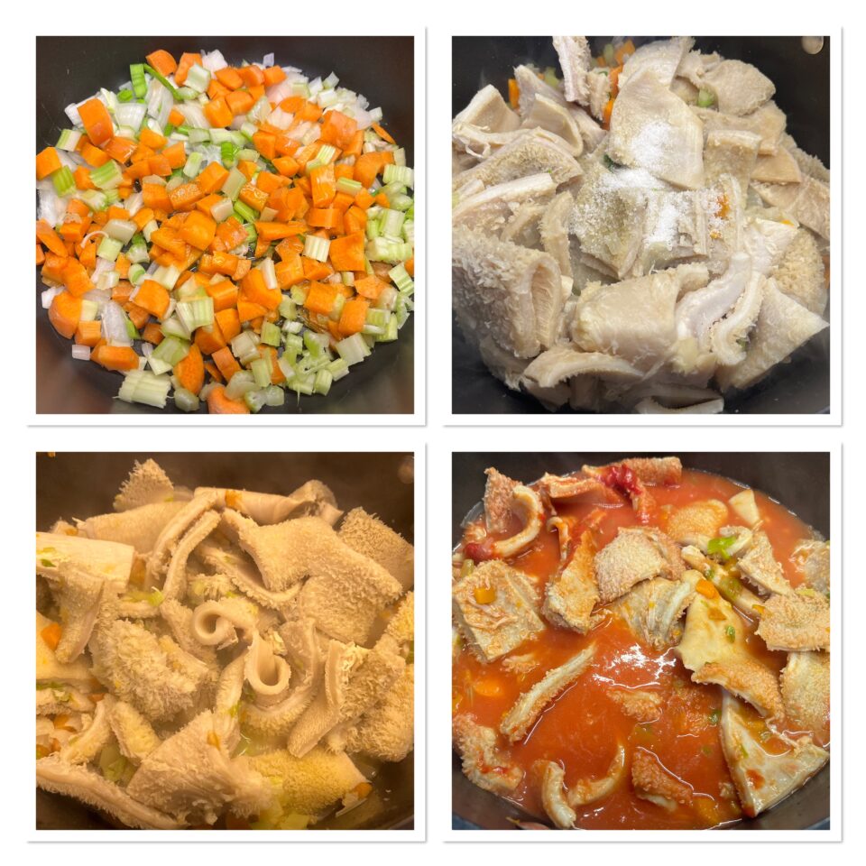 Comparate dal vostro macellaio o al supermercato della trippa già pulita, eviterete il fastidioso e difficile lavoro che serve per sbiancarla. Sciacquate e pelate le verdure e tagliatele a pezzettini, lasciate appassire a fiamma vivace, unite la trippa, il sale e cuocete per qualche minuto (se volere aggiungete mezzo bicchiere di vino bianco e sfumate). Unite la passata di pomodoro, il peperoncino, un bicchiere colmo d’acqua e cuocete con il coperchio, a fuoco basso per 2h.