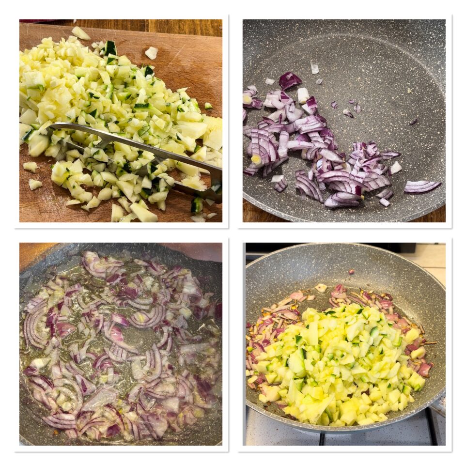 Tritate una cipolla piccola e rosolatela con un buon giro d’olio. Unite la polpa delle zucchine tritata, aggiustate di sale e attendete che si cuocia e insaporisca bene, basteranno 10-15 minuti.