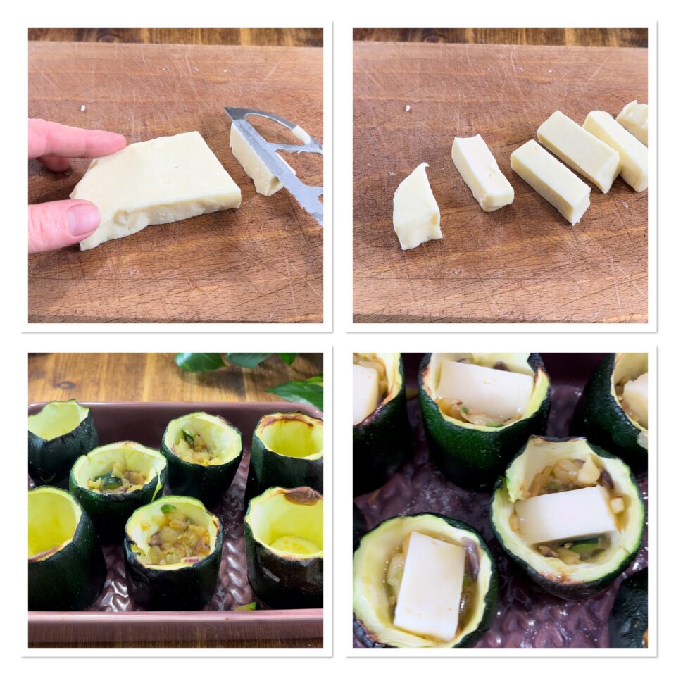 Tagliate il formaggio a tocchetti, sfornate le zucchine e farcitele con un po’ della polpa che avete cucinato, il formaggio e ancora un po’ di polpa.