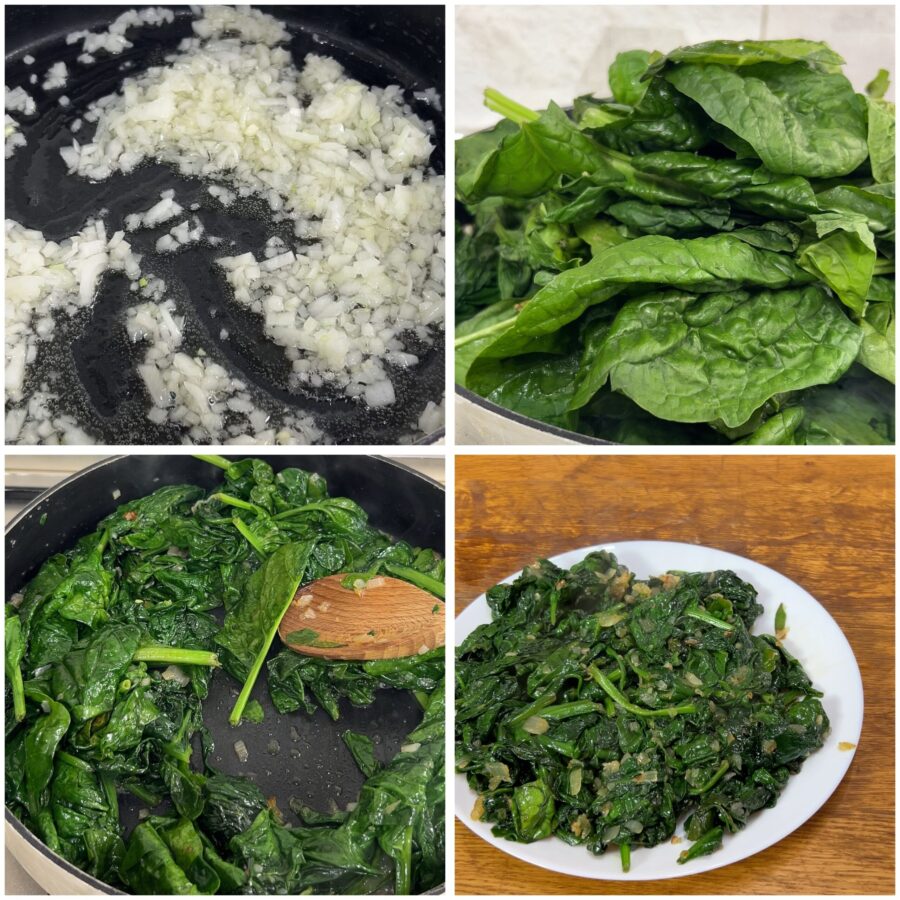 Per fare la torta rustica agli spinaci, tritate finemente la cipolla e rosolatela con un buon giro d’olio, unite gli spinaci, puliti, sciacquati più volte e scolati molto bene.