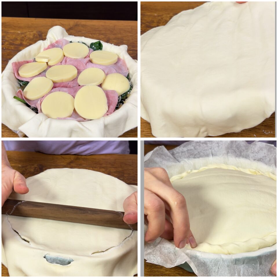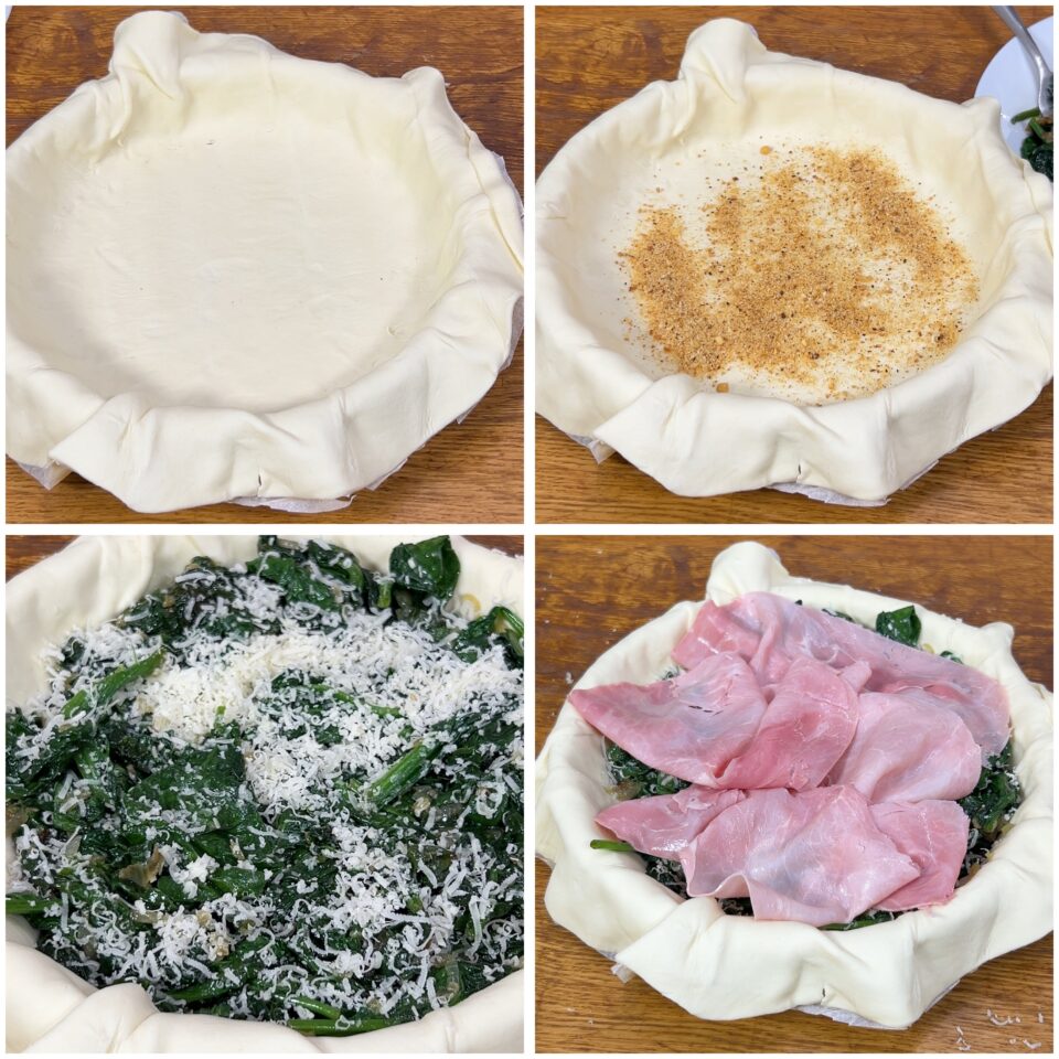 Per una versione vegetariana della torta salata agli spinaci, omettete il prosciutto, sostituendolo con del formaggio a fette.