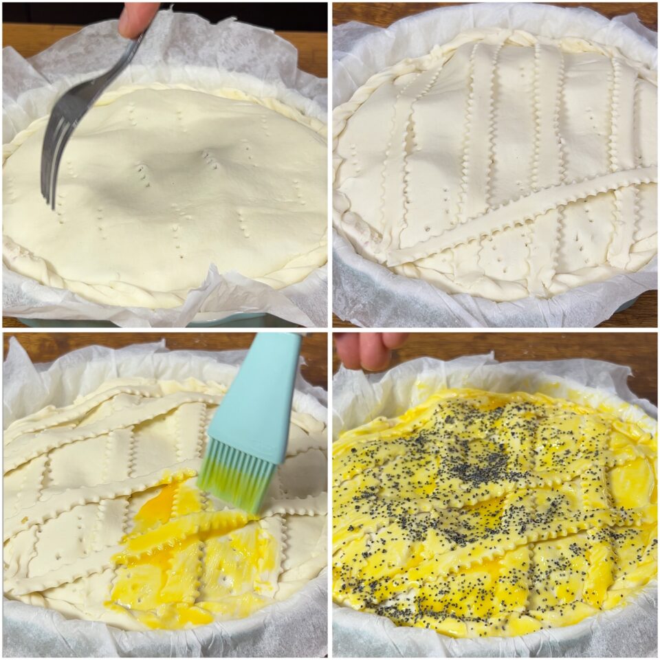 Eliminate la pasta che sborda (passandovi sopra con un mattarello), sigillate i margini della torta salata e bucherellatene la superficie con i rebbi di una forchetta.