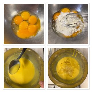 Stemperate la farina e lo zucchero con i tuorli e unite il latte poco per volta fino ad ottenere un composto omogeneo. Cuocete a bagnomaria mescolando di continuo, fino a raggiungere gli 80°il. A questo punto il composto dovrebbe cominciare ad addensare e nappare il cucchiaio, spegnete e non andate oltre per evitare di stracciare i tuorli. Togliete la crema dal fuoco per evitare che continui a cuocere e mettete da parte. Unite la colla di pesce alla crema e amalgamate, poi mettete da parte a raffreddare un po’.
