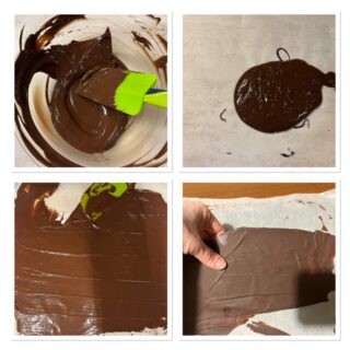 Per i veli di cioccolata basterà fondere ancora dell’altro cioccolato e spalmarlo su della carta forno, per poi riporre in frigo 30 minuti (poggiate su un vassoio magari).