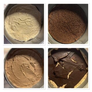 Versate il resto della bavarese alla nocciola, coprite con altri veli di cioccolato e finite con l’ultimo strato di bavarese al cioccolato. Prendete disco croccante e poggiatelo sulla torta con la parte ruvida rivolta verso la crema. Date qualche colpetto per fare uscire le bolle d’aria e riponete nel congelatore per 12 ore.