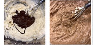Dividete in due parti uguali la bavarese, in uno unite la pasta di nocciole, e nell’altra il cioccolato fusa ma non caldo, a circa 32°C. ).