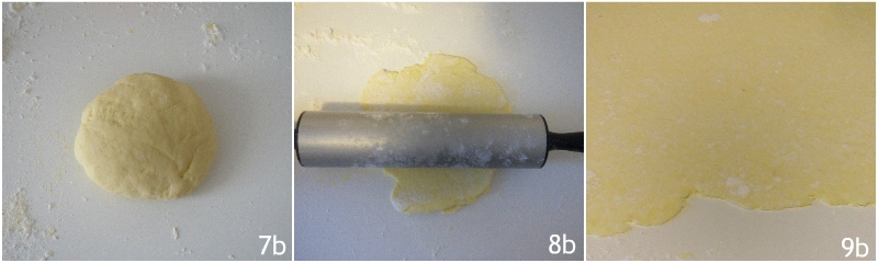Se usate la macchinetta per la pasta, stendete l’impasto con il mattarello, formando un rettangolo lungo e stretto (8a). Infarinatelo bene e passatelo tra i rulli al massimo spessore (9a).