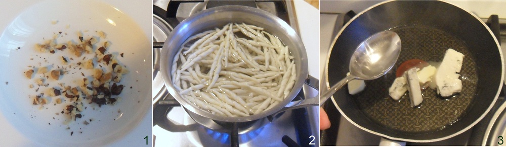 Per preparare la pasta al gorgonzola e noci la prima cosa da fare è sgusciare le noci e tritarle grossolanamente (1). Lessate quindi la pasta in abbondante acqua salata (2) e, mentre cuoce, preparate il condimento: in una padella mettete il burro e il gorgonzola a pezzetti, accendete a fiamma molto bassa e aggiungete qualche cucchiaio di acqua di cottura (3).