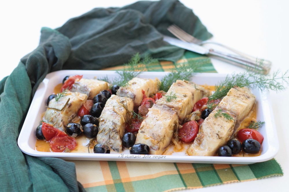 Quando anche i pomodori saranno appassiti, unite al sugo i tranci di ombrina e le olive. Se la salsa dovesse risultare troppo asciutta aggiungete poca acqua. Con un cucchiaio prendete della salsa e versatela sopra ad ogni trancio. Coprite con il coperchio e lasciate cuocere ancora per 10 minuti.