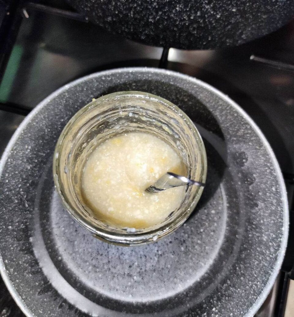 Portiamo ad ebollizione un pò di acqua nel pentolino. A fuoco spento mettiamo il vasetto di marmellata cristallizzata o dura nell’acqua e facciamola ammorbidire a bagnomaria.