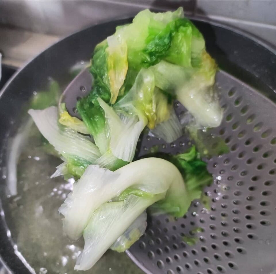 Quando le foglie hanno assunto il colore verde scuro sono pronte per essere scolate in una scolapasta, con una schiumarola di plastica; e continuiamo a calare altre piccole manciate di scarola fino a quando saranno finite.