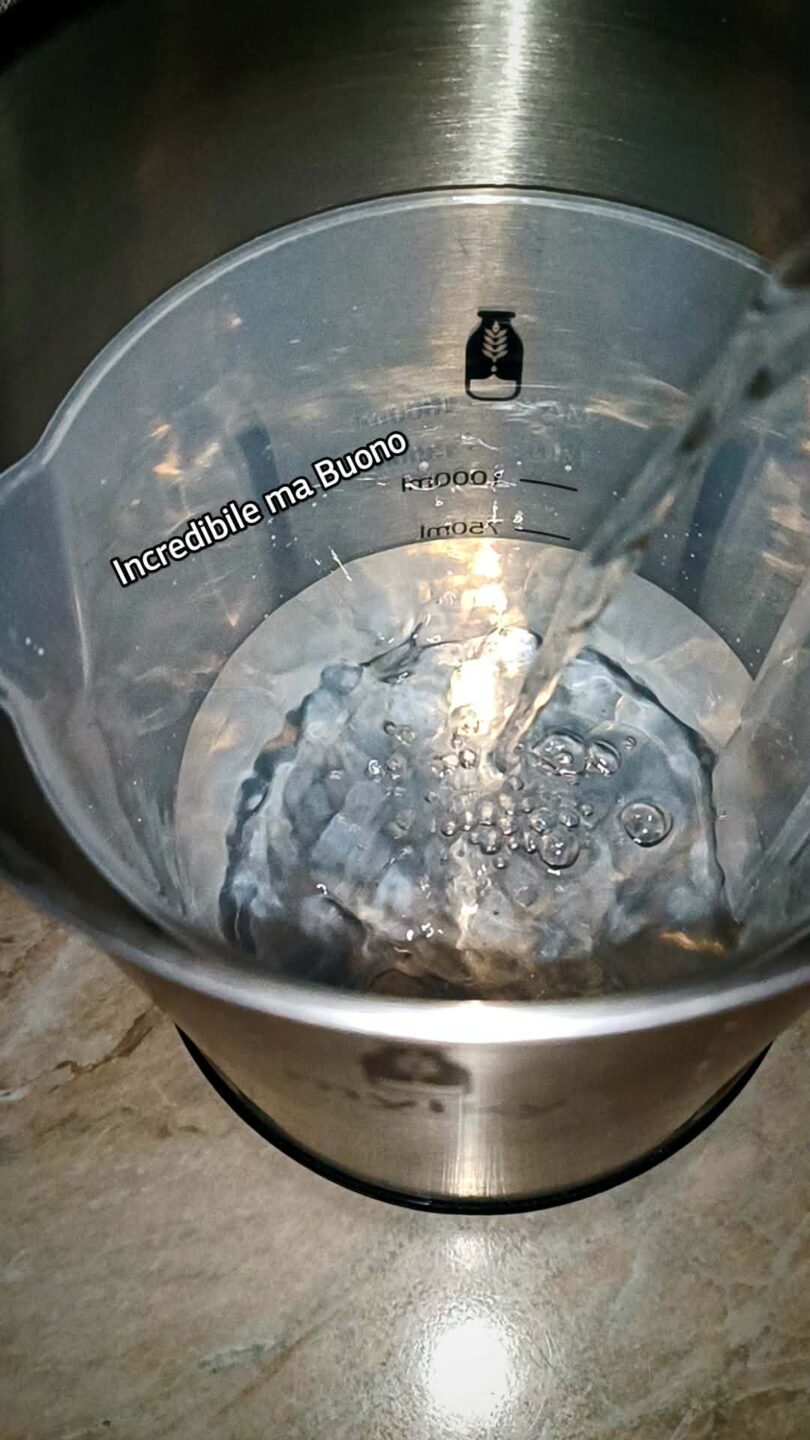 Riempiamo la caraffa di plastica con 750 ml di acqua naturale fredda, direttamente all’interno del serbatoio della macchina Mylky; aggiungiamo 2 cucchiai di olio extravergine di oliva.
