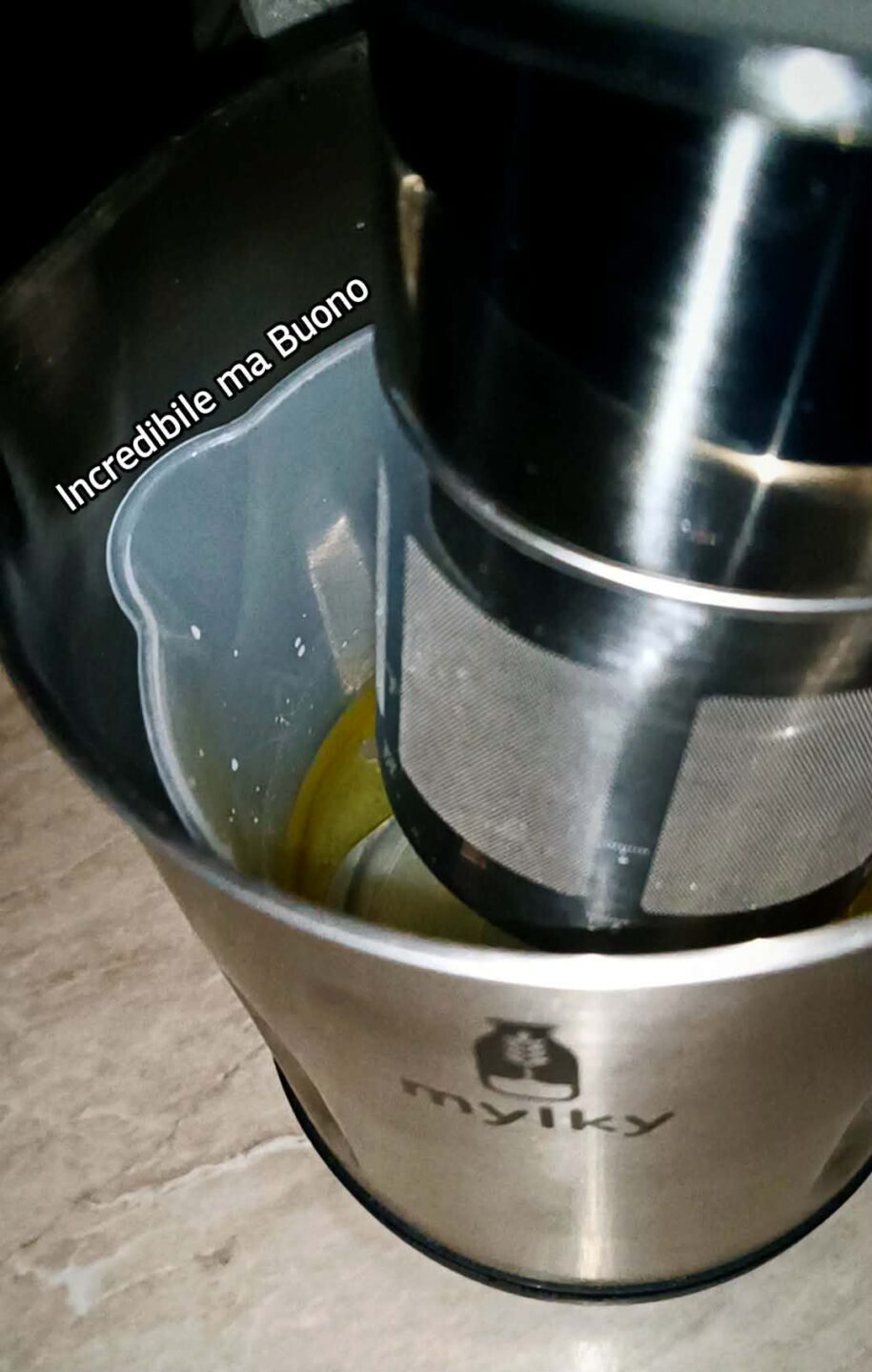 Finito il ciclo di lavorazione, solleviamo il coperchio, lasciandolo gocciolare per bene, e mettiamolo in una ciotola capiente per far uscire il restante liquido; togliamo la caraffa di plastica dal serbatoio, agganciamogli la maniglia in dotazione, e versiamo la bevanda nella bottiglia Mylky.