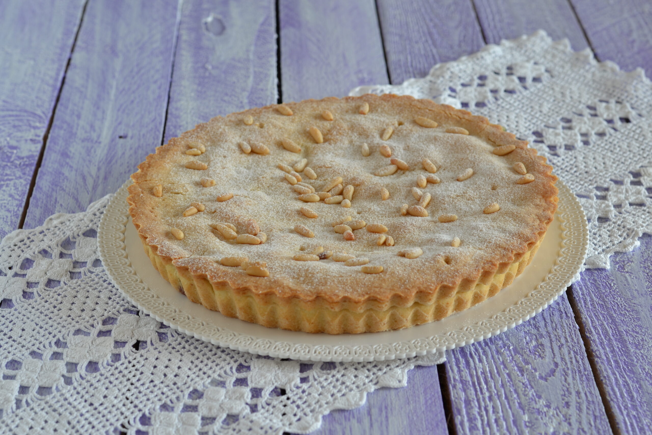Distribuire i pinoli sulla superficie premendo un pò con le mani per fermarli nella pasta. Con uno stecchino praticare dei piccoli fori sulla torta in modo che la crema e la marmellata cuocendo non rompano la pasta.