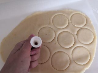 Stendere il panetto (tra due fogli di carta forno) fino ad uno spessore di 5-6 mm. Con una formina a fiore creare i biscotti. Se non avete la formina adatta, per ricreare il buco al centro del biscotto, potete utilizzare un beccuccio da sac à poche.
