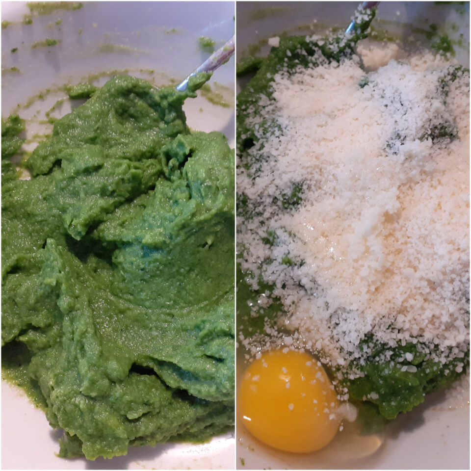 Con il frullatore a immersione riduco i broccoli in purè e li verso in una ciotola, poi unisco uova e parmigiano, regolo di sale e pepe, infine mescolo bene per amalgamare tutti gli ingredienti. Se il composto risulta troppo morbido aggiungo un cucchiaio raso di pangrattato.