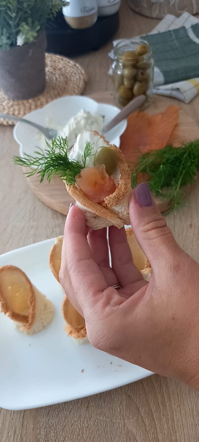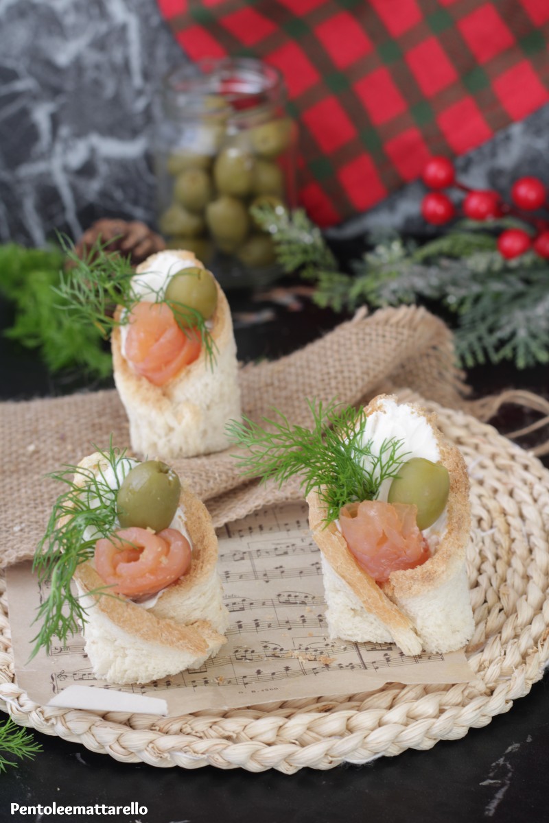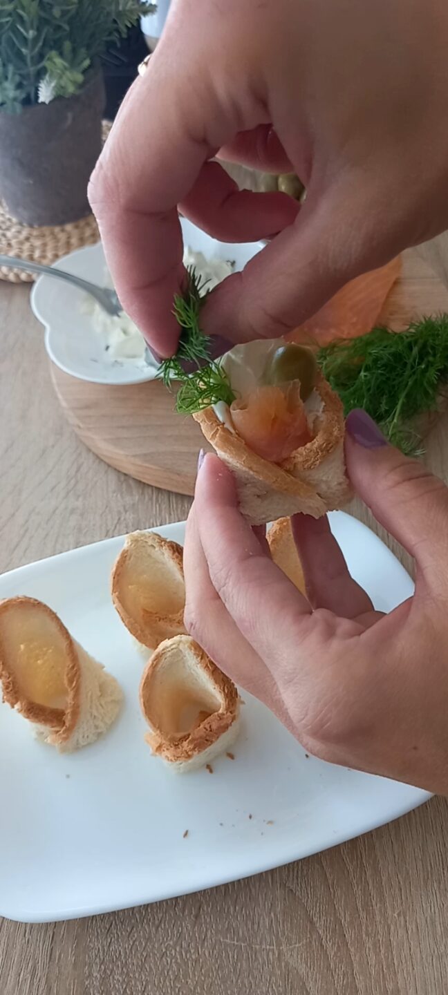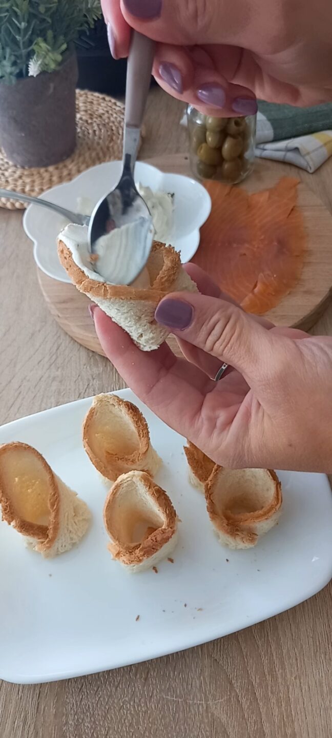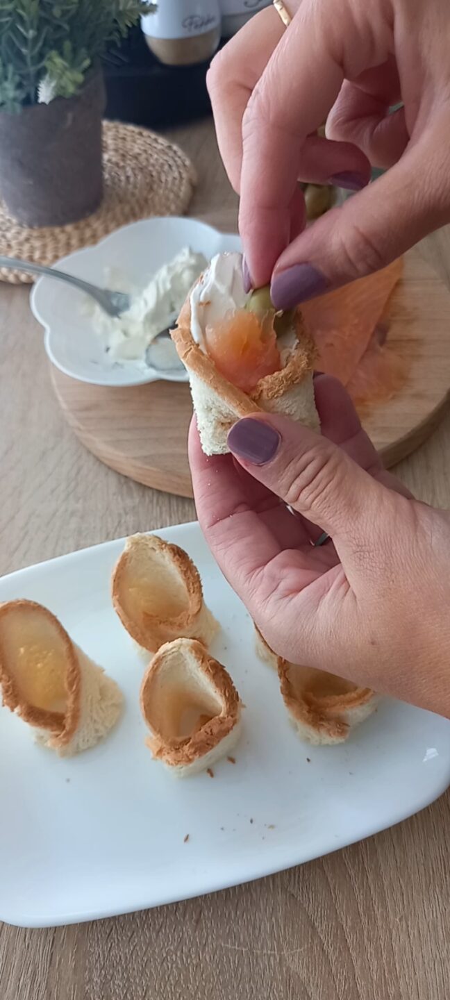Al centro mettete un cucchiaino di formaggio spalmabile e una striscia di salmone a forma di rosa.