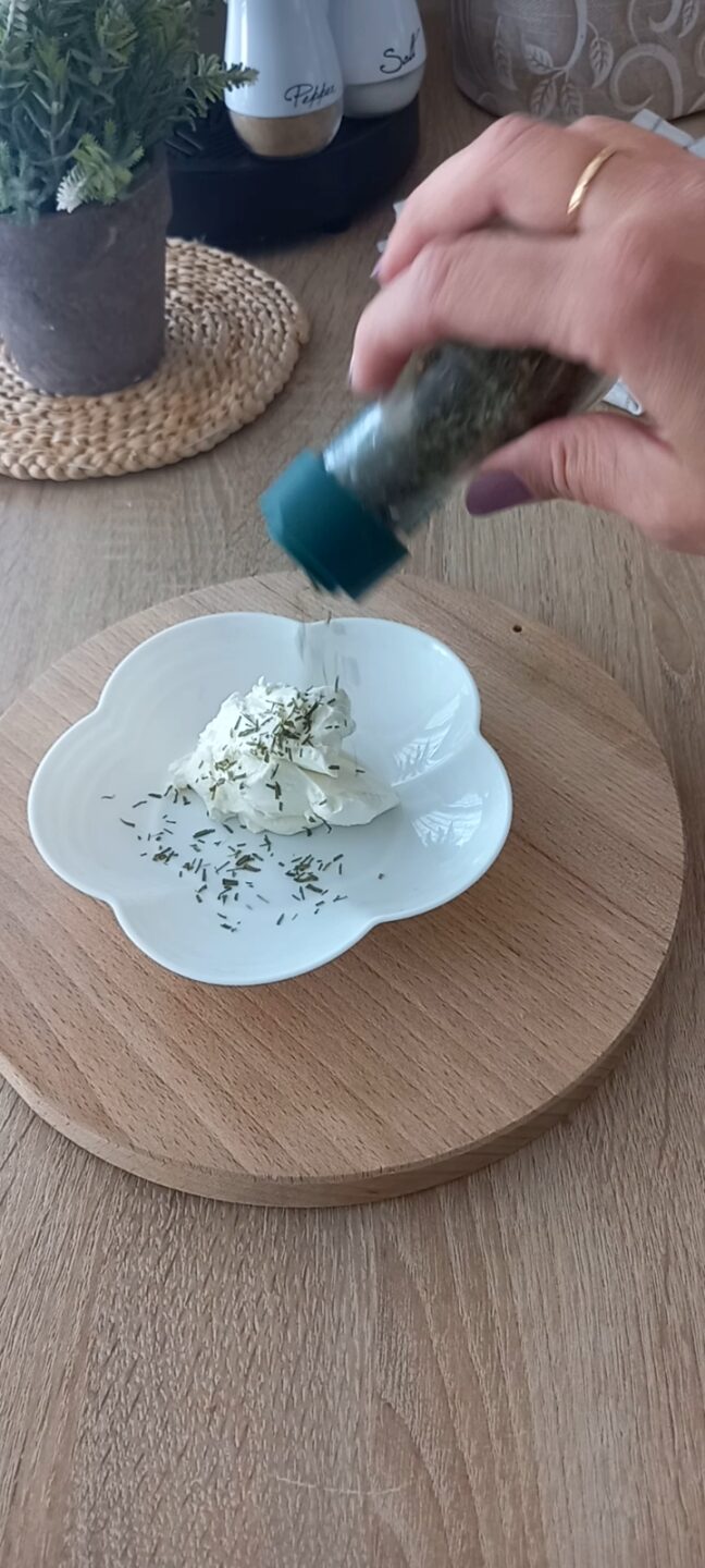 Nel frattempo in una ciotola mettete il formaggio spalmabile e un po’ di erba cipollina.