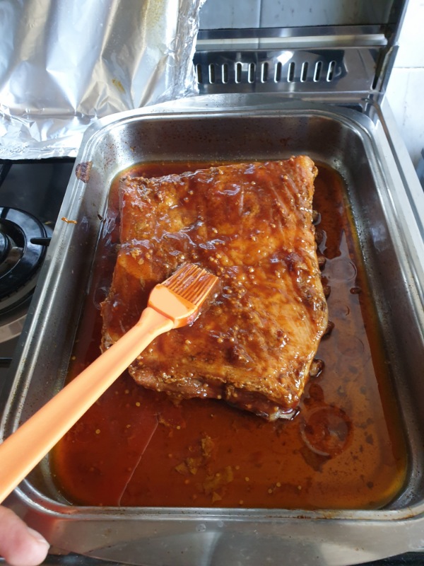 Durante la cottura, di tanto in tanto, girarle le costine di maiale e spennellarle con la salsa bbq al miele e aggiungere brodo al bisogno in modo da evitare che le costine in salsa barbecue si secchino troppo.