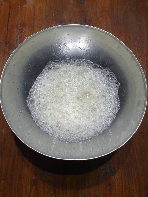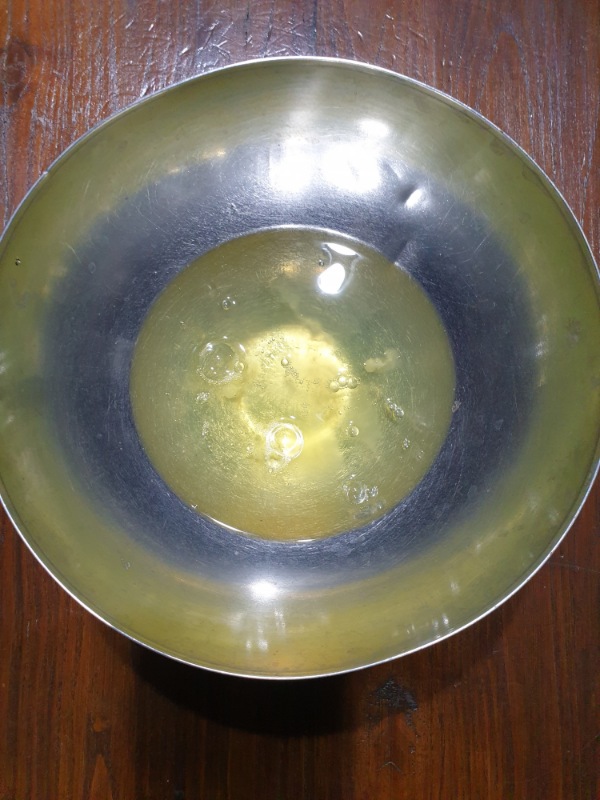 Versare gli albumi in una scodella e iniziare a sbatterli (con una forchetta, una frusta a mano o con le fruste elettriche). Non occorre montare gli albumi, sarà sufficiente che non siano più trasparenti, diventando bianchicci.