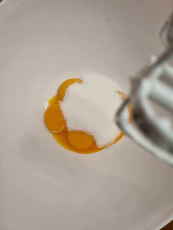 Aggiungere un po’ di albumi montati nella massa di tuorli, mescolando delicatamente dal basso verso l’alto per non smontare il tutto.