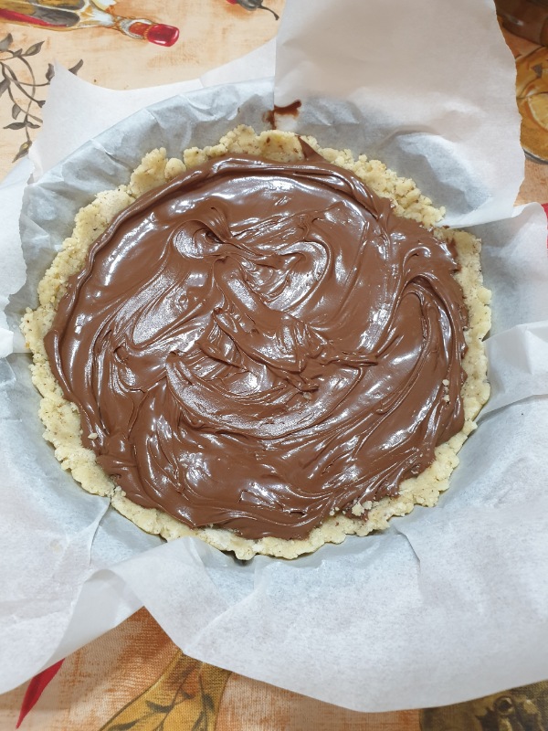Versare la nutella nel guscio di pasta frolla: vi consiglio di fare uno strato alto di nutella, in modo che in cottura non si secchi. Meno nutella mettete, più seccherà in cottura; più nutella mettete, più resterà cremosa in cottura.
