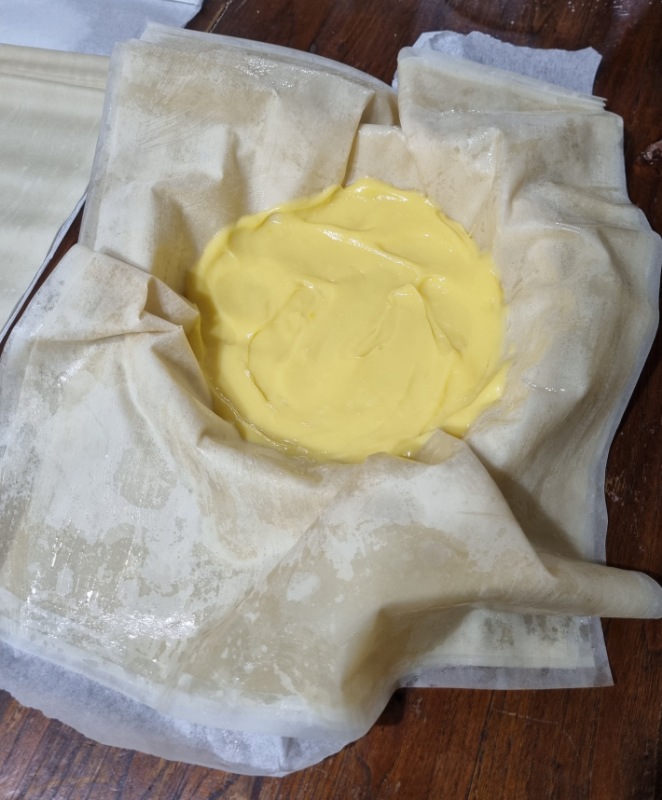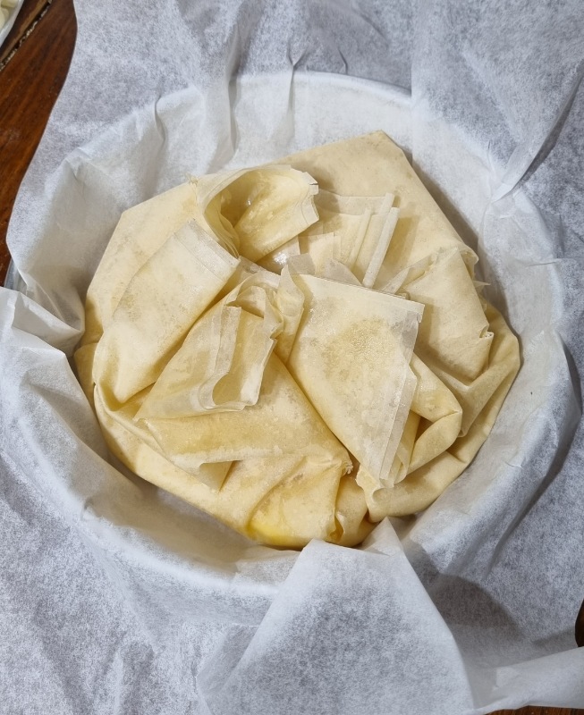 Trasferire la pasta fillo (con la sua carta forno) in una teglia di circa 20-22 centimetri di diametro.