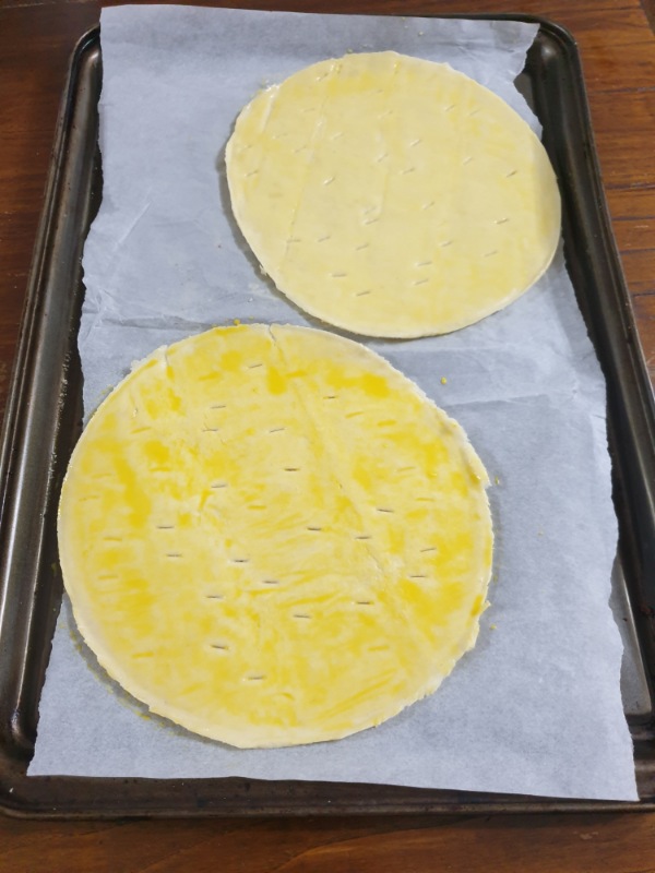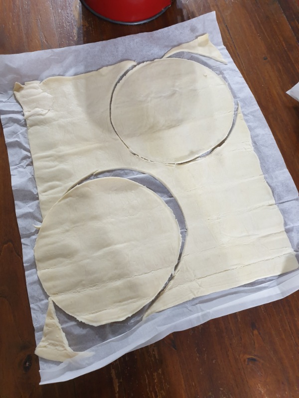 Srotolare la pasta sfoglia e ritagliarvi due dischi di circa 16-18 centimetri di diametro. Per essere precisa, io ho utilizzato una teglia come “guida”.