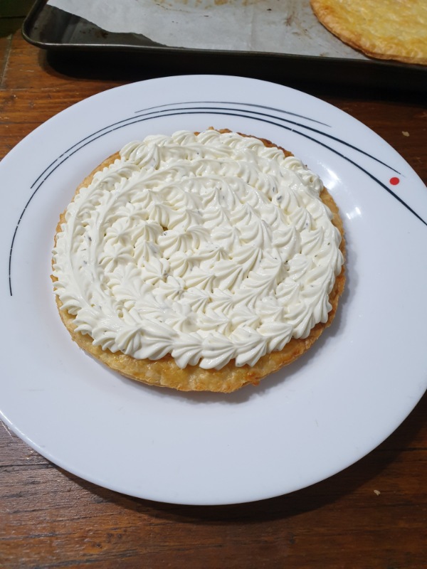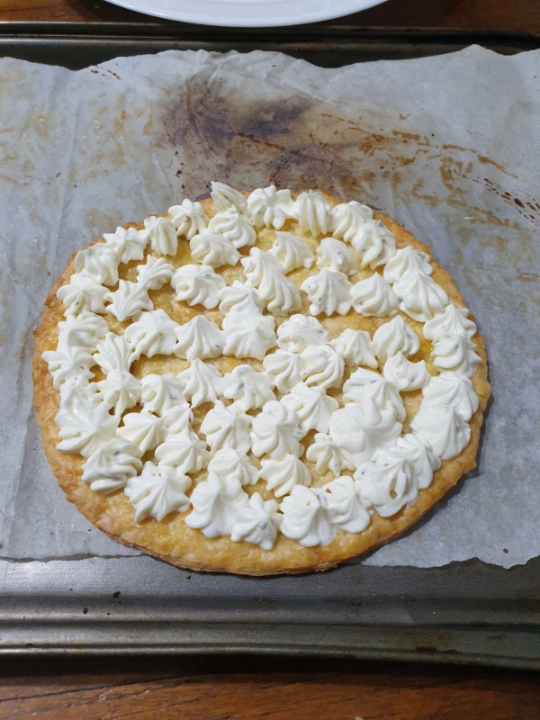Versare la crema al formaggio in una sac a poche col beccuccio a stella e farcire in superficie il disco di pasta sfoglia con piccoli ciuffetti di crema al formaggio.