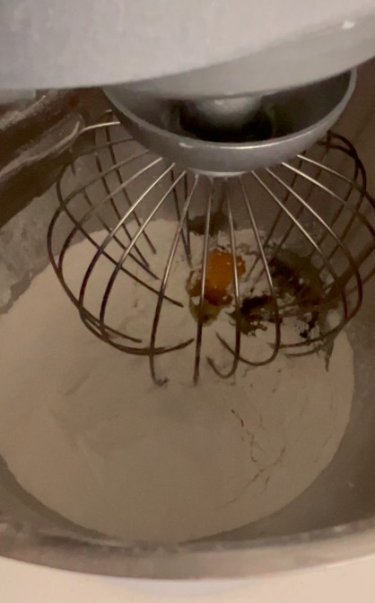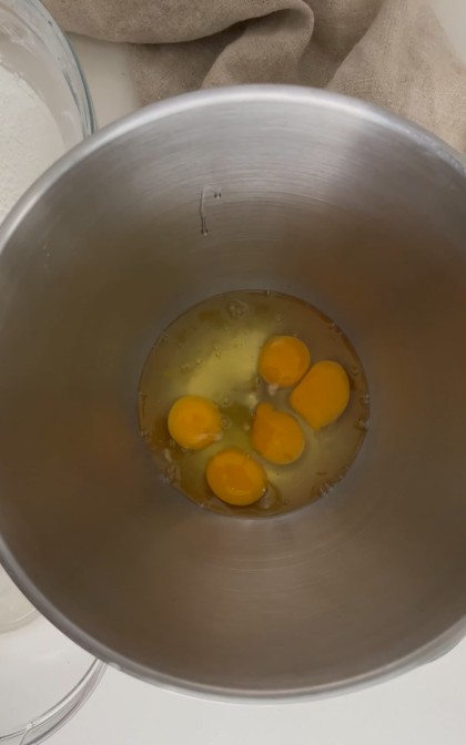 Mettere in frigo e iniziare a preparare l’impasto per le tette delle monache. In planetaria inserire le uova,