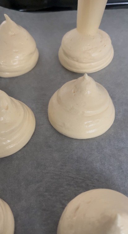 Mettere in un sac a poche con bocchetta liscia e formare sulla teglia ricoperta da carta forno dei cerchi terminando con la classica punta