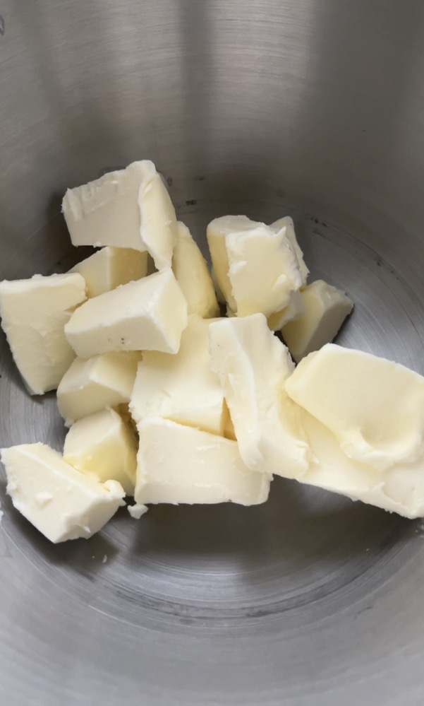 In planetaria inserire il burro che deve essere rigorosamente morbido a pomata. Senon avete la planetare versate tutto in coppa e lavorate con le fruste elettriche.
