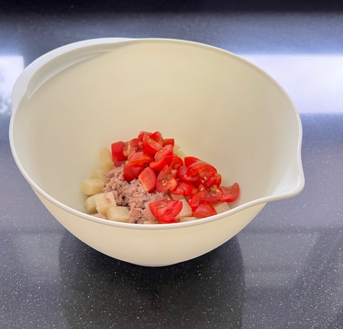 Taglia gli ingredienti proteici: formaggio proteico, pomodorini, tonno al naturale.