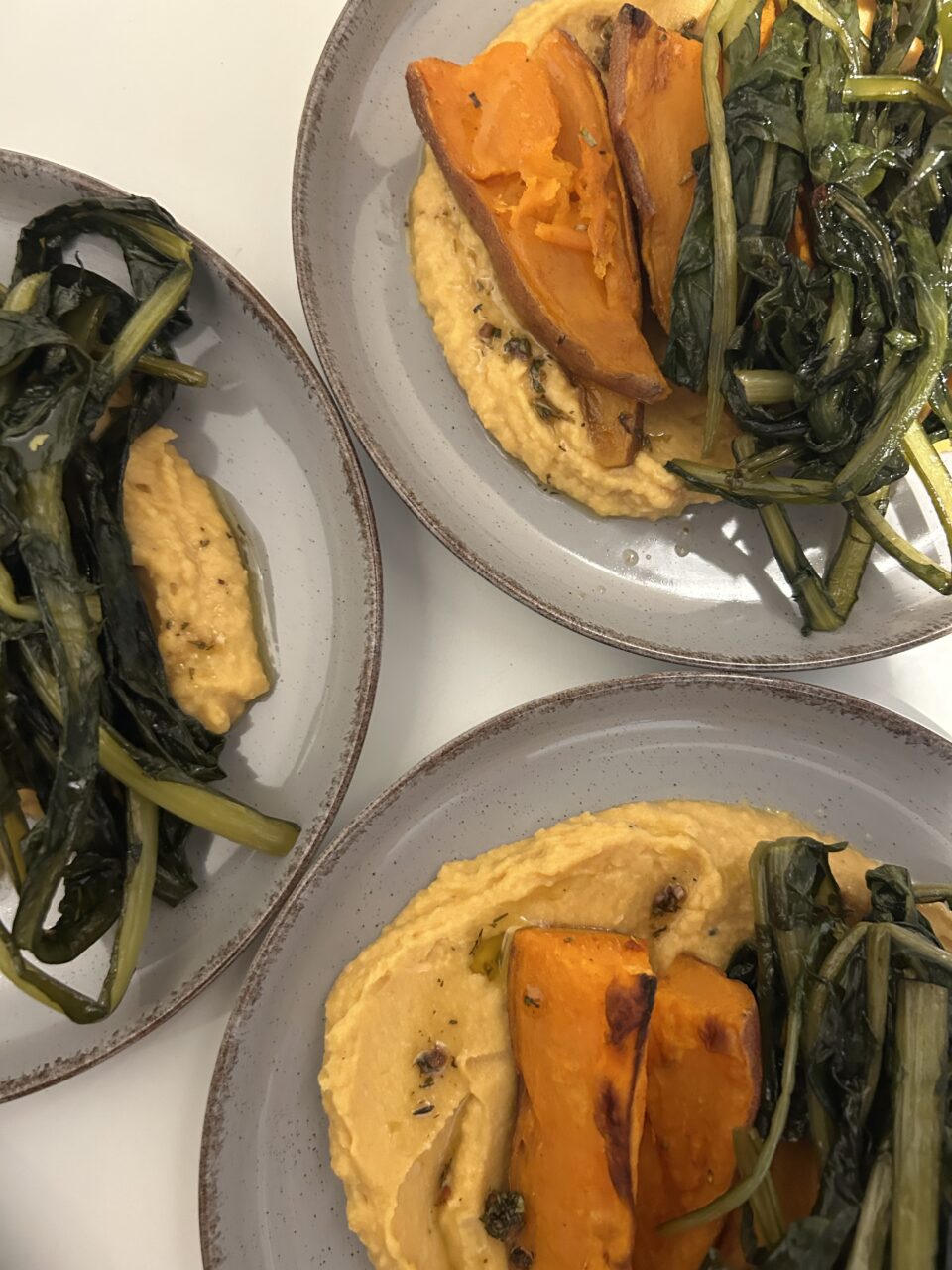 Impiattate l’hummus, con le patate dolci, la cicoria e, con un cucchiaino, aggiungete qualche goccia di chimichurri.